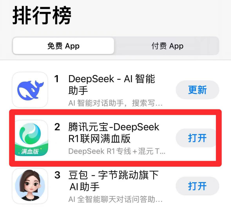 在接入DeepSeek十天后,从2月22日开始,腾讯旗下的AI应用“腾讯元宝”,就超越字节旗下AI应用豆包,跃居中国区苹果应用商店免费APP下载排行榜第二位,并一直维持至今。