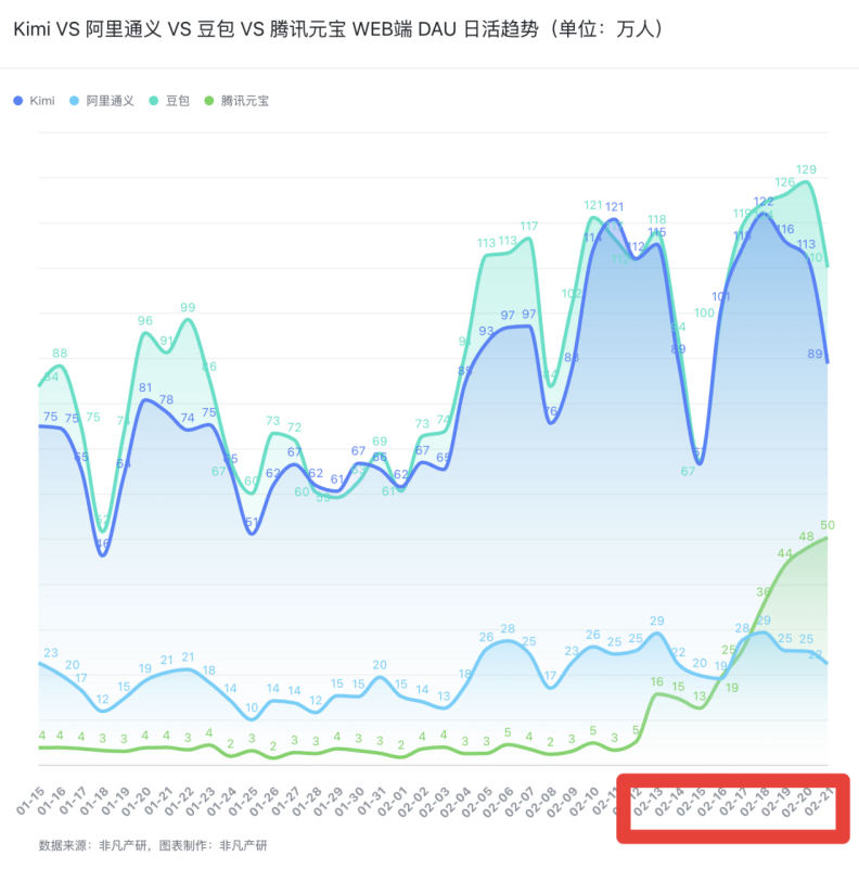 图注:豆包VS腾讯元宝web端日活趋势 图源:非凡产研