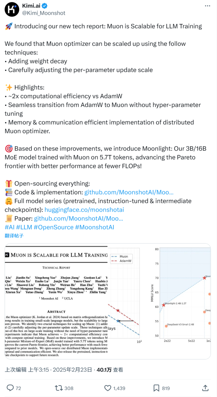 2 月 24 日消息,月之暗面 Kimi 昨日发布了“Muon 可扩展用于 LLM 训练”的新技术报告,并宣布推出“Moonlight”:一个在 Muon 上训练的 30 亿 / 160 亿参数混合专家模型(MoE)。使用了 5.7 万亿个 token,在更低的浮点运算次数(FLOPs)下实现了更好的性能,从而提升了帕累托效率边界。