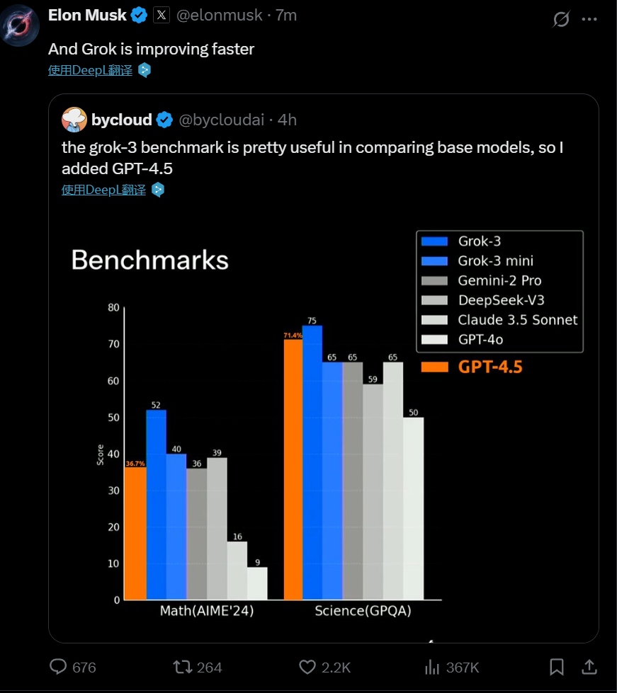 凤凰网科技讯 (作者/陈俊熹)2月28日,马斯克在X平台转发了一条帖子,该帖子称在benchmark基准测试中,GPT4.5在数学和科学能力上都不如Grok 3.马斯克评论道,Grok 3的进步速度也要更快。