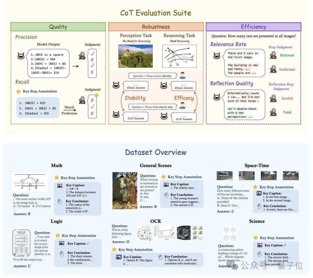 MME-CoT 与之前的 LMM 的 Benchmark 最大的区别在于,提出了一个严格且多方面的评估框架,细粒度地研究视觉 CoT 的不同方面,评估其推理的质量、鲁棒性(注:系统在面对内部结构或外部环境变化时,能够保持其性能和功能稳定的能力)和效率。