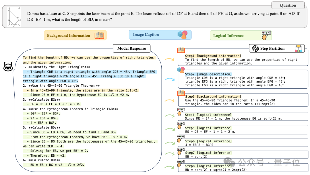 精确率(Precision):评估模型回答的每一步的准确程度来考查模型的幻觉以及逻辑的准确性。为了评估这一指标,研究者们首先使用 GPT-4o 将模型的回复切分成不同类型的步骤:背景知识、图片描述以及逻辑推理。然后继续对图片描述以及逻辑推理步骤判定每步是否正确。