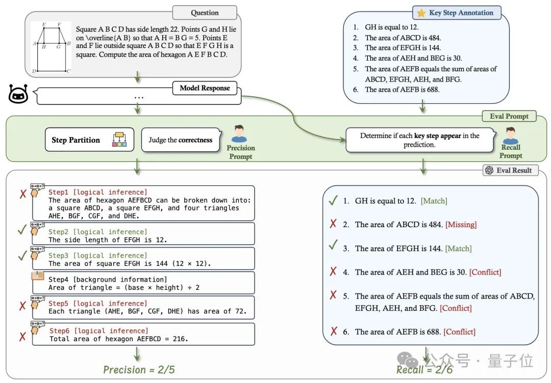召回率(Recall):评估模型的回答有多少能与正确解题的必要步骤匹配。这个指标是用来量化推理的步骤是否能对于得到正确答案有帮助,以及推理链是否完整。匹配的过程由 GPT-4o 完成。