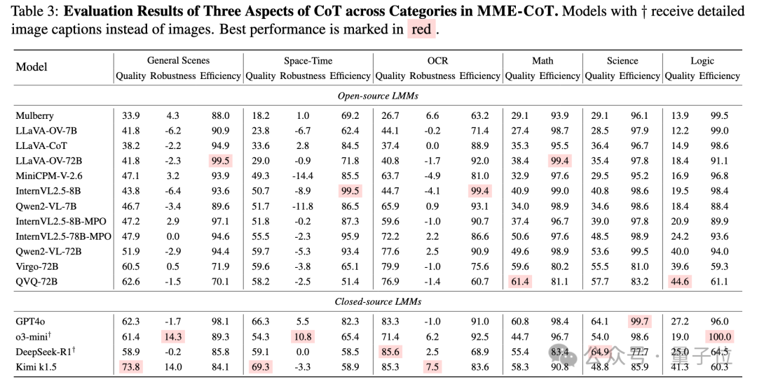 各种最新推出的 LMM,包括 Kimi k1.5, GPT-4o, QVQ 等等都在 MME-CoT 上进行了测试。同时,研究者们还把图片转成 caption 之后测试了最近爆火的 DeepSeek-R1 以及 o3-mini。
