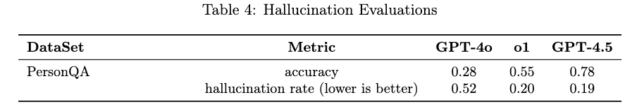 在 PersonQA 数据集上,GPT-4.5 取得了 0.78 的准确率,优于 GPT-4o(0.28)和 o1(0.55)。