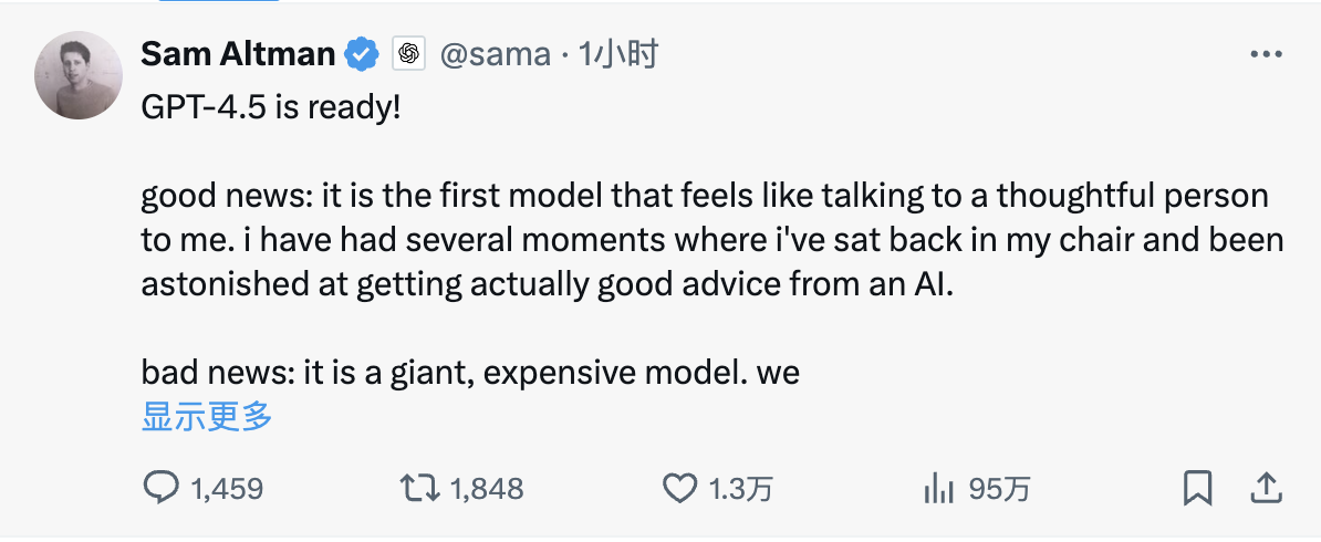 不过,他也特别提醒,GPT-4.5 不是推理型模型,不会在基准测试中碾压其他模型。而他之所以没有亮相发布会,原因是在医院照顾小孩。