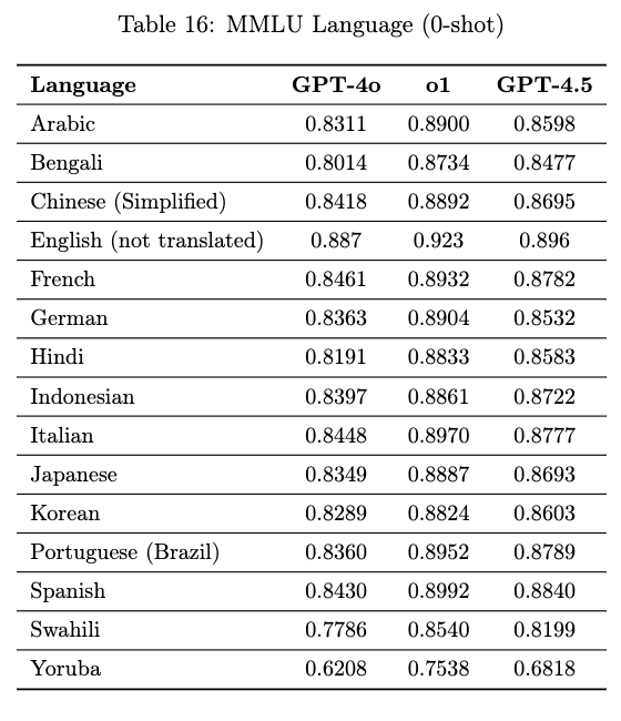 多语言性能方面,GPT-4.5 支持 14 种语言,在 MMLU 评估中超越了 GPT-4o,尤其在低资源语言(如斯瓦希里语、约鲁巴语)上有明显提升。