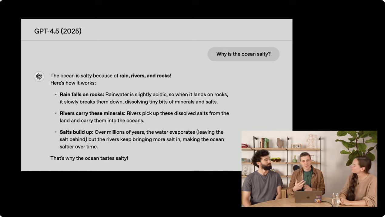 另一个演示则展示了 GPT-4.5 在解释复杂问题上的能力,「为什么海水是咸的?」