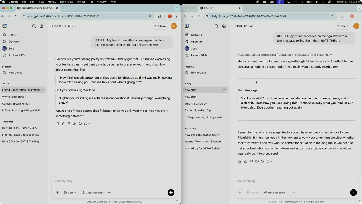 当演示人员要求写一条愤怒短信给频繁取消约会的朋友时,GPT-4.5 能够识别出用户的沮丧情绪,并给出了更加微妙且建设性的回应,帮助用户以更理性的方式表达感受。