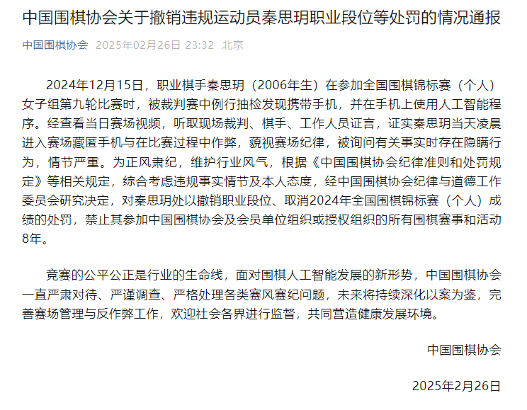 2024 年 12 月 15 日,职业棋手秦思玥(2006 年生)在参加全国围棋锦标赛(个人)女子组第九轮比赛时,被裁判赛中例行抽检发现携带手机,并在手机上使用人工智能程序。经查看当日赛场视频,听取现场裁判、棋手、工作人员证言,证实秦思玥当天凌晨进入赛场藏匿手机与在比赛过程中作弊,藐视赛场纪律,被询问有关事实时存在隐瞒行为,情节严重。为正风肃纪,维护行业风气,根据《中国围棋协会纪律准则和处罚规定》等相关规定,综合考虑违规事实情节及本人态度,经中国围棋协会纪律与道德工作委员会研究决定,对秦思玥处以撤销职业段位、取消 2024 年全国围棋锦标赛(个人)成绩的处罚,禁止其参加中国围棋协会及会员单位组织或授权组织的所有围棋赛事和活动 8 年。