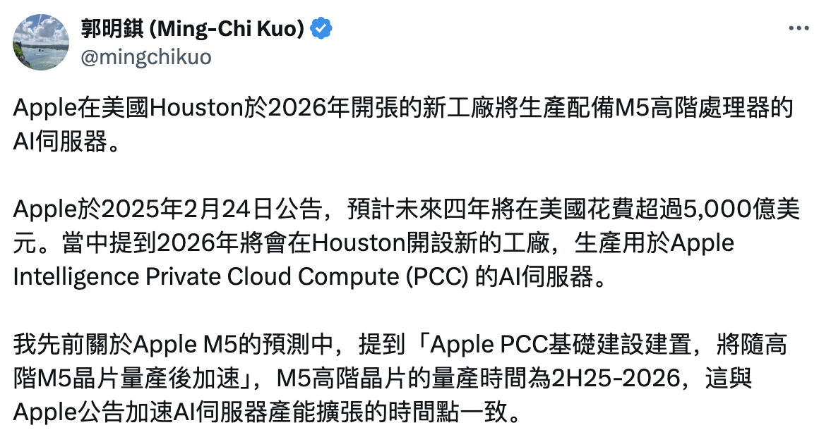 导读:M5芯片凤凰网科技讯 北京时间2月25日,知名苹果分析师郭明錤周二在X上透露,苹果位于美国得州休斯顿的新工厂将于2026年开张,届时将生产配备M5高端处理器的AI服务器。苹果周一宣布,将于未来四年在美国投资5000亿美元,其中包括在2026年在休斯顿开设新工厂,生产用于Apple Intelligence私有云计算(PCC 的AI服务器。郭明錤的帖子郭明錤指...