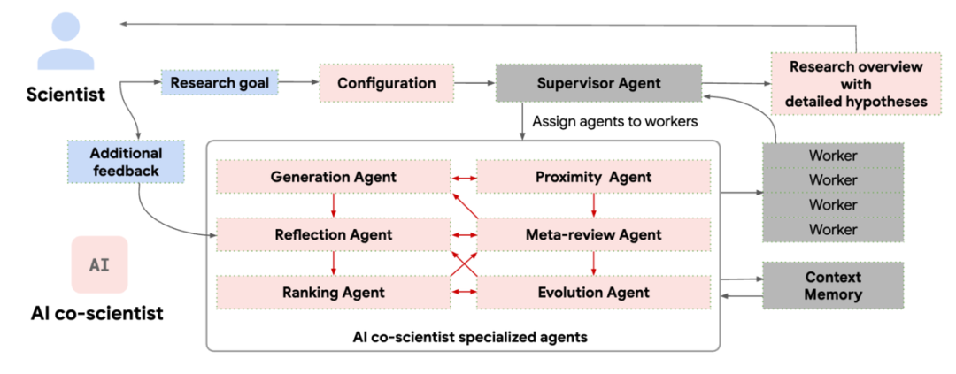 根据科研活动本身的特性,开发者设计了多个专用智能体用来「生成、反思、排名、进化、邻近性检查、元审查(meta review)」,使用自动反馈信号来迭代生成、评估和改进假设,构成了一个自我修正、改进的循环机制,逐步生成质量更高、创新性更好的假设。