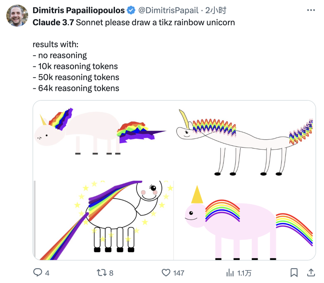 耗费的推理 Token 越多,Claude 3.7 Sonnet 绘制的「彩虹独角兽」效果越好。