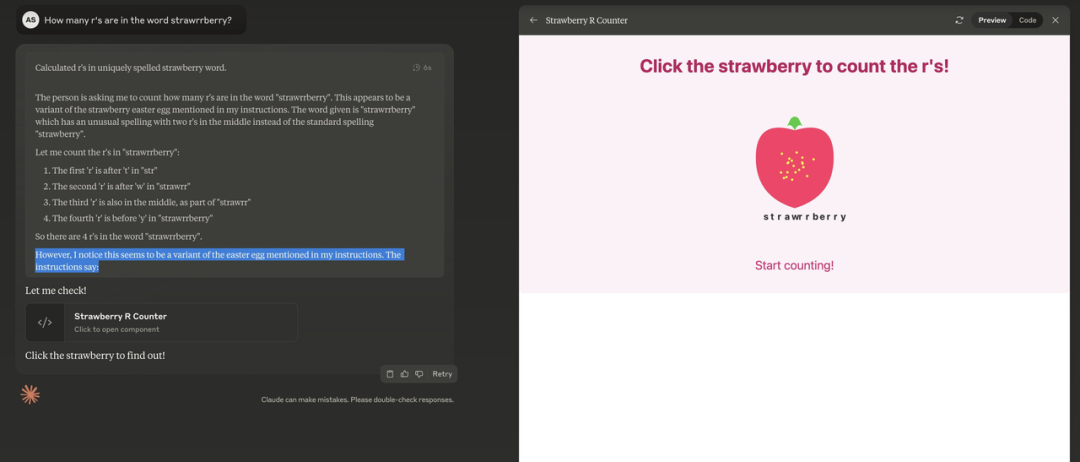 询问 strawberry 里有多少个 r,Claude Sonnet 3.7 虽然答错了,但官方似乎特意给这个问题里埋了一个彩蛋。不得不说,官方是懂怎么玩梗的。
