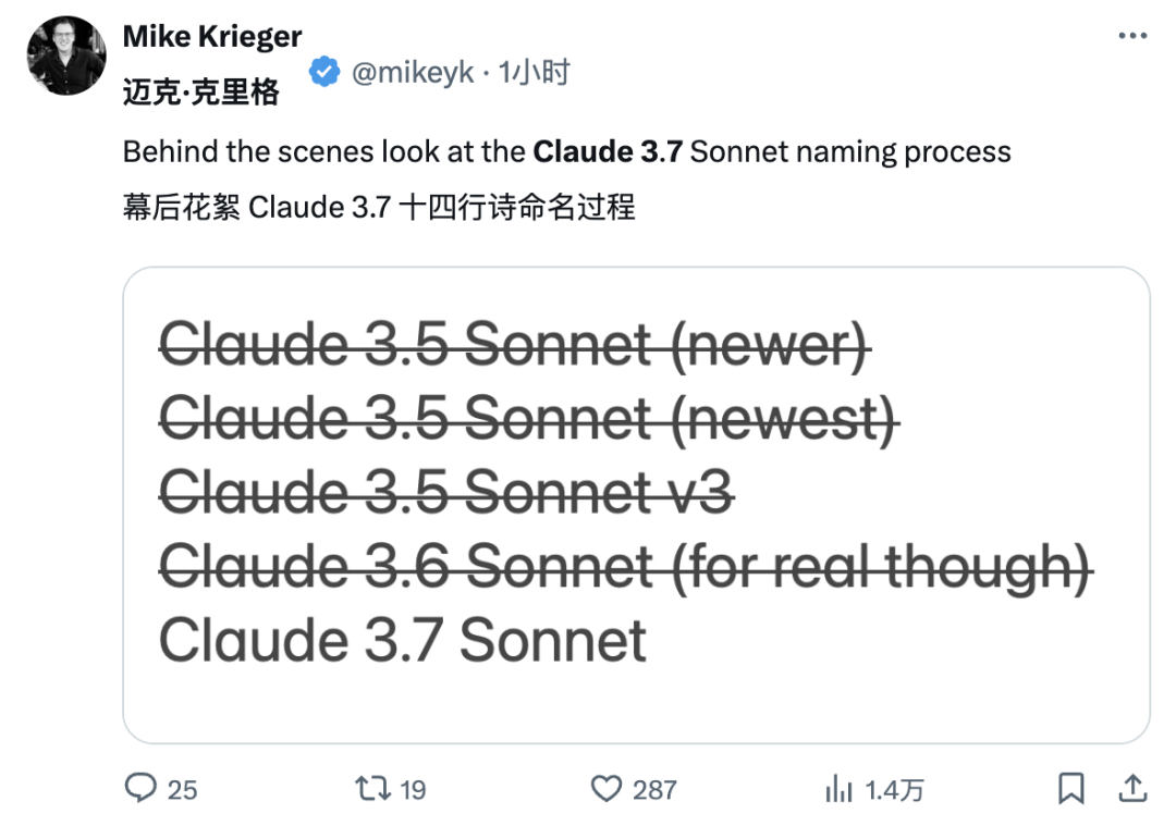 Anthropic 首席产品官 Mike Krieger 今天也在 X 平台公布了 Claude 3.7 Sonnet 的幕后命名花絮。 内心的纠结过程大概是这样👇