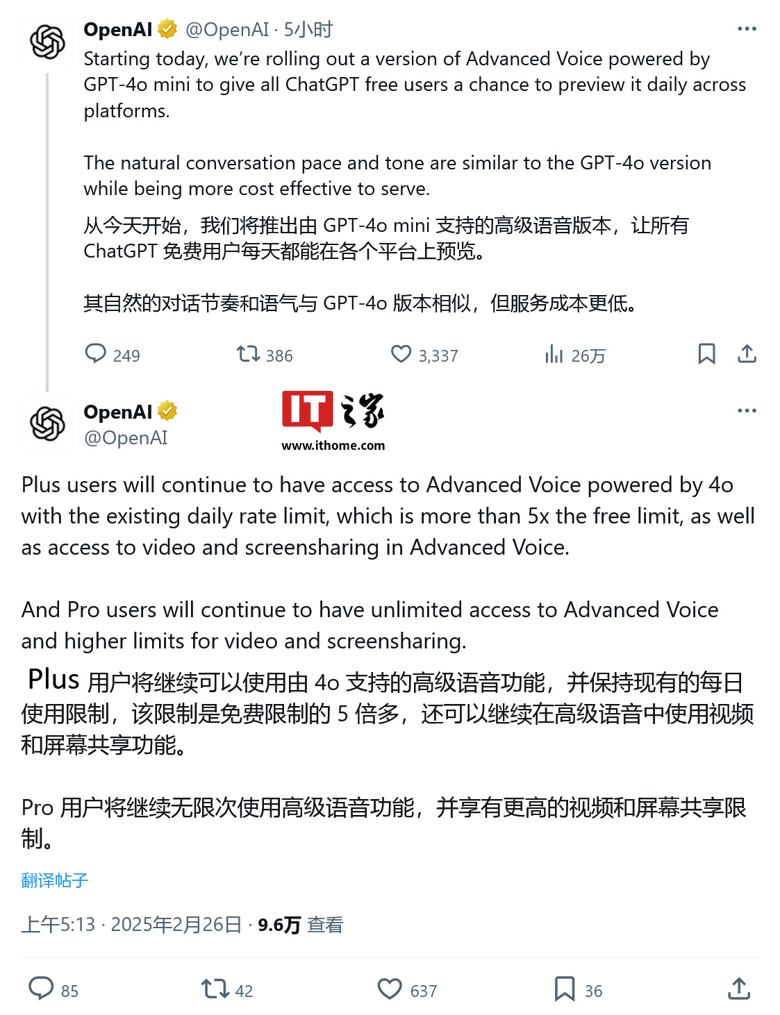 导读:IT之家 2 月 26 日消息,OpenAI 公司今天(2 月 26 日)在 X 平台发布推文,宣布免费开放 ChatGPT 高级语音模式(Advanced Voice Mode),让更多用户体验更自然的语音对话。该模式基于 GPT-4o mini 模型,通过优化计算效率,在性能方面媲美完整版的 GPT-4o 模型。该功能此前仅限付费订阅用户,现在所有用户均...