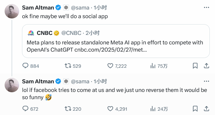 OpenAI 奥尔特曼幽默回应 Meta 拟推独立 AI 应用:也许我们该做社交 App 了