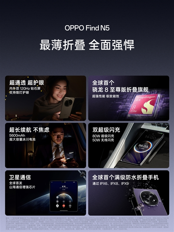配置方面,全新的OPPO Find N5搭载高通骁龙8至尊版旗舰平台,后置5000万像素超光影主摄、5000万像素超光感潜望镜头以及800万像素超广角镜头的三摄相机模组。电池容量是5600mAh,支持80W有线和50W无线闪充,还支持10W反向充电,支持IPX6、IPX8、IPX9满级防水。此外,1TB版本还支持卫星通信,确保用户实时稳定连接,OPPO还与高德地图深度合作,实现卫星实时同步救援信息,为用户出行安全保驾护航。