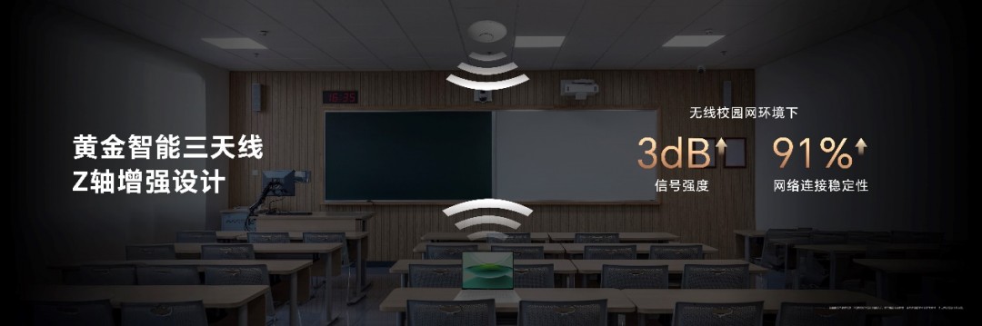 更值得一提的是,本次还首发了静音高性能设计,在HONOR Turbo X的调校下,办公、直播、游戏等场景噪音最低可达17dB,带来极致的静音体验;同时采用行业领先的黄金智能三天线设计,支持450米、360°无死角的超远距离联网,在无线校园网环境下,信号强度和网络连接稳定性都大幅提升。
