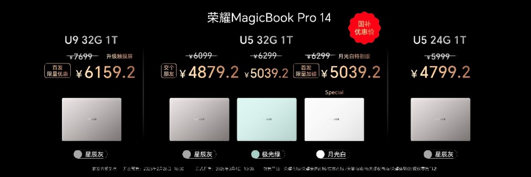 荣耀MagicBook Pro 14为消费者提供多种配置选择,Ultra5+24GB+1TB国补到手价4799.2元,Ultra5+32GB+1TB国补到手价4879.2元,Ultra9+32GB+1TB触控屏版到国补手价6159.2元,于2月26日16:30开启预售,3月4日10:08正式开售。