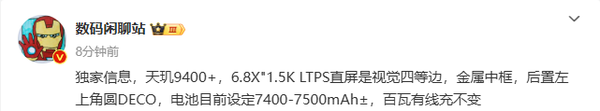 其他方面,该博主表示,REDMI K80至尊版将配备一块6.8英寸的OLED屏幕,屏幕分辨率为1.5K,支持LTPS技术,视觉四等边,机身采用金属中框设计,后置圆形相机模组,位于背部左上角。硬件上除了将搭载天玑9400+处理器外,还将内置7400mAh-7500mAh的超大电池,将成为REDMI家族乃至小米手机家族电池容量最大的机型,同时将支持百瓦有线快速充电,预计不支持无线充电。