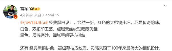 去年10月底,全新的小米15系列正式发售,包含小米15和小米15 Pro两款机型,其中小米15依然维持了小尺寸旗舰的定位,小米15 Pro则更是小米迄今最强的旗舰,两款新机一经亮相便受到了大家的广泛关注。而除了这两款机型外,该系列还将在本月推出超大杯的小米15 Ultra,定位影像旗舰。日前小米官方终于宣布,该机将于2月27日正式亮相。现在有最新消息,近日雷军进一步带来了该机的设计细节。